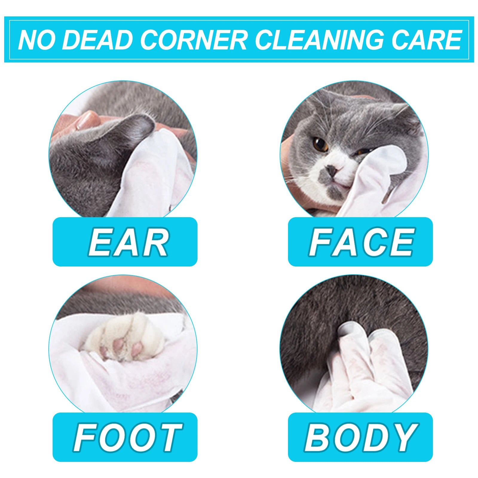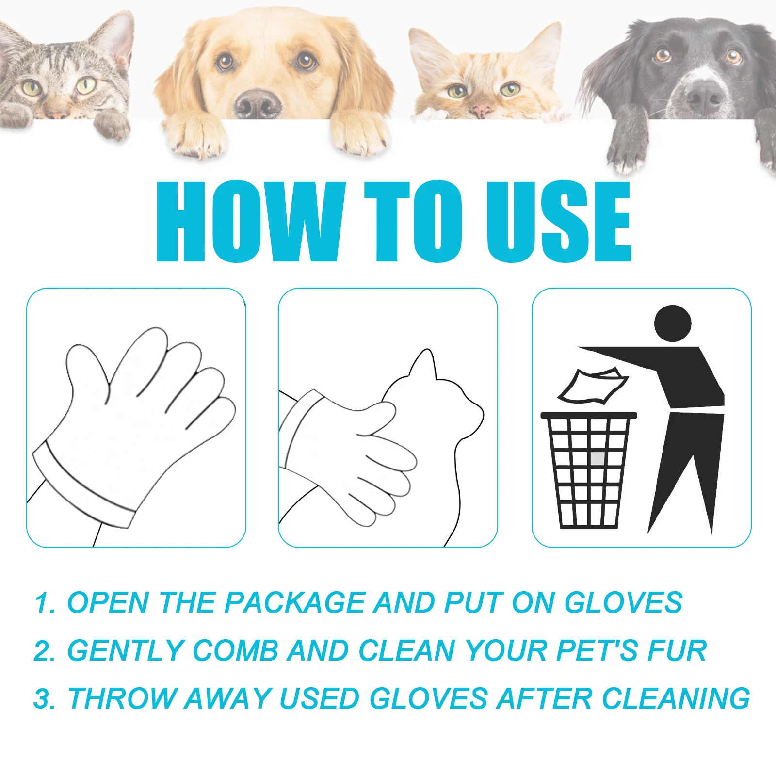 Our disposable pet cleaning glove wipes contain olive oil, tea tree oil, coconut oil. It can groom and clean pets, keep hair shiny, prevent tangles, reduce shedding, and keep skin healthy. The way to use it is very simple: first open the package, put on the gloves, then gently comb and clean the pet's fur, and throw away the used gloves after washing. Pet after use not only helps keep your pet's fur shiny, but also prevents tangles, reduces shedding, and keeps skin healthy.